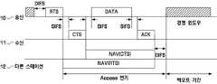 도 1은 종래에 충돌을 피하기 위해 NAV 값을 설정하는 과정을 보여주는 블록도이다. 도 1은 송신 스테이션(10)에서 데이터를 전송하기 전에 RTS(Request To Send)라는 프레임을 보낸다. 이는 수신 스테이션(11)과 다른 스테이션(12)이 모두 인지가능하다. 이 프레임에 의해 수신 스테이션(11)은 CTS(Clear To Send) 프레임을 보낸다. 그리고 상기 RTS 프레임에 의해 다른 스테이션(12)은 네트워크할당벡터(Network Allocation Vector; 이하, NAV라 함)를 설정한다(가상 캐리어 센싱). NAV값에 의해 다른 스테이션은 NAV 값이 0으로 될 때 까지 데이터를 송신하지 않는다. 또한 수신 스테이션(11)이 송신한 CTS 프레임에 의해 NAV 값을 다시 설정할 수 있다. RTS 프레임을 수신 못한 경우라도 CTS 프레임의 수신을 통해 NAV 값을 다시 설정할 수 있다. 이후 송신 스테이션에서 수신 스테이션에 데이터를 보낼 때 까지 다른 스테이션들은 매체를 사용하지 않는다. 다른 스테이션(12)은 프레임을 다른 스테이션에 송신하려고 할 때 NAV 기간이 지나고나서 분산 프레임간 간격(Distributed Inter-Frame Space; 이하, DIFS라 함)을 기다린 후에 랜덤 백오프를 하고 프레임을 다른 스테이션에 전송할 수 있다.1 is a block diagram illustrating a process of setting a NAV value in order to avoid a collision in the related art. 1 sends a frame called RTS (Request To Send) before transmitting data at the transmitting station 10. This is both recognizable to the receiving station 11 and the