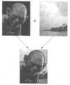 상기 도7의 위 왼쪽 영상신호는 배경 영상신호이고, 위 오른쪽 영상신호는 대상 영상신호 이며, 상기 배경 영상신호는 알파블랜딩 처리되어 반투명 상태이고, 상기 배경 영상신호의 위에 합성 신호처리된 상태가 아래에 도시되어 있다.The upper left image signal of FIG. 7 is a background image signal, the upper right image signal is a target image signal, and the background image signal is alpha-blended and translucent, and the composite signal processing state on the background image signal is below. Is shown.