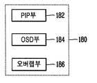 상기 제어부(110)에 접속하고 티비방송과 촬영에 의한 영상신호를 선택하여 합성 신호처리하고 출력하는 것으로, 상기 제어부(110)의 제어에 의하여 수신된 티비방송 영상신호와 카메라 촬영된 영상신호 중에서 선택된 영상신호의 크기를 축소하고 배경 영상신호의 지정된 위치에 출력하도록 합성 신호처리하여 출력하는 피아이피부(180); 상기 제어부(110)의 제어에 의하여 수신된 티비방송 영상신호와 카메라 촬영된 영상신호 중에서 선택된 배경 영상신호 위에 알파블랜딩된 영상신호가 합성되어 출력되도록 신호처리하는 오에스디부(184); 상기 제어부(110)의 제어에 의하여 수신된 티비방송 영상신호와 카메라 촬영된 영상신호 중에서 선택된 오브젝트 추출 영상신호를 배경 영상신호의 위에 합성되어 오버랩(OVERLAP) 상태로 출력 되도록 신호처리하는 오버랩부(186)로 이루어지고, 상기 제어부(110)의 제어에 의하여 입력되는 티비방송 영상신호와 카메라 촬영된 영상신호 중에서 선택된 영상신호를 바탕화면으로 설정하고 또한, 선택된 영상신호는 피아이피(PIP) 처리이거나 오에스디(OSD) 처리이거나 오버랩(OVERLAP)에 의한 오브젝트 처리의 영상합성 신호처리하고 출력하는 합성부(180)와,It is connected to the