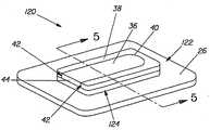 도 4 내지 도 6 을 참조하면,  박층 (24) 의 부피에 대한 박층 (24) 의 노출 표면적의 비율을 최소화하는 본 발명의 바람직한 실시형태가 설명될 것이다.     치아 미백 시스템 (120) 은 치아에 사용되는 제 1 섹션 (36) 을 구비한 기재 (122) 를 포함하고,  제 2 섹션 (38) 은 캐리어 (26) 와 남아있다.     약하거나 나누어질 수 있는 분리부 (예컨대,  관통선,  부분 슬릿 등) 는 기재 (122) 의 제 1 섹션 (36) 과 제 2 섹션 (38) 이 사용자에 의해 완전 분리될 때까지 적어도 부분적으로 상호연결되도록 슬릿 (40) 대신에 사용될 수 있지만,  제 1 섹션 (36) 과 제 2 섹션 (38) 은 기재 (122) 의 두께를 바람직하게 관통하는 슬릿 (40) 으로 분리된다.     슬릿 (40) 은 평면도에서 실질적으로 U 형상인 것이 바람직하고,  슬릿 (40) 의 양단부 (42) 는 기재 (122) 의 공통 가장자리 (44) 로부터 신장한다.     상기 배열은 바람직하지만,  다른 슬릿 배열이 제공될 수 있음을 알 수 있다.     기재 (122) 의 제 1 섹션 (36) 과 제 2 섹션 (38) 은,  도 6 에 도시한 바와 같이,  치아 미백 조성물의 박층 (124) 의 각 제 1 섹션 (46) 과 제 2 섹션 (48) 위에 놓인다.     즉,  치아 미백 조성물의 제 1 섹션 (46) 은 기재 (122) 의 제 1 섹션 (36) 과 실질적으로 같이 신장하지만,  치아 미백 조성물의 제 2 섹션 (48) 은 기재 (122) 의 제 2 섹션 (38) 과 실질적으로 같이 신장한다.     치아 미백 조성물의 제 1 섹션 (46) 과 제 2 섹션 (48) 은 제 2 섹션 (48) 의 안정 효과를 향상시키기 위해서 사용시 분리될 때까지 서로 일체화되는 것이 바람직하다.     하지만,  치아 미백 조성물의 제 1 섹션 (46) 과 제 2 섹션 (48) 간의 부분 분리 또는 완전 분리는,  이후에 자세히 설명된 바와 같이,  슬릿 (40) 을 형성하는 작업시 나타날 수 있다.     치아 미백 조성물의 박층 (124) 의 제 2 섹션 (48) 을 추가함으로써 노출 표면적 (50) 의 비교적 더 적은 증가량에 대한 제 2 섹션 (48) 을 추가함으로써 치아 미백 조성물의 박층 (124) 의 비교적 더 큰 부피로 인해,  치아 미백 시스템 (129) 에서 치아 미백 조성물의 박층 (124) 의 부피에 대한 노출 표면적의 비율은 치아 미백 시스템 (20) 의 박층 (24) 의 비율보다 비교적 더 작다.4 to 6, a preferred embodiment of the present invention will be described which minimizes the ratio of the exposed surface area of the