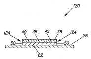 가요성 강성은 스트립 두께,  폭,  및 재료의 탄성 계수를 결합한 함수의 재료 물성이다.     상기 시험은 폴리올레핀 필름 및 시트의 강도를 측정하는 방법이다.     수평 빔의 단부에 고정된 스트레인 게이지를 사용하여 샘플의 비가요성을 측정한다.     빔의 반대 단부는 샘플이 놓여 있는 수평대내의 수직 홈으로 스트립의 일부를 가압하도록 샘플의 스트립을 가로질러 가압한다.     스트레인 게이지에 연결된 마이크로암미터(microammeter) 는 변형력을 그램으로 눈금을 정한다.     샘플의 강도는 마이크로암미터로부터 직접 측정되어 샘플 스트립 폭의 단위 센티미터당 그램으로 나타난다.     본 발명에는 필요하지 않지만 바람직한 실시형태에 있어서,  가요성 기재는,  시험방법 ASTM D2923-95 에 따라,  펜실베니아주,  필라델피아에 위치한 드윙-알버트 도구사 (Thwing-Alber Instrument Co.) 로부터 구입가능한 모델 #211-300,  핸들-오-미터 (Handle-O-Meter) 상에서 측정된 약 5  그램/cm 미만의 가요성 강성을 가진다.     바람직하게는,  기재 (22) 는 약 4 그램/cm 미만,  보다 바람직하게는 약 3 그램/cm 미만,  가장 바람직하게는 약 0.1 그램/cm 내지 약 1 그램/cm 의 가요성 강성을 가진다.Flexible stiffness is a material property of a function that combines strip thickness, width, and elastic modulus of the material. The test is a method of measuring the strength of polyolefin films and sheets. The strain gauge fixed at the end of the horizontal beam is used to measure the inflexibility of the sample. The opposite end of the beam is pressed across the strip of sample to press a portion of the strip into a vertical groove in the horizontal bar on which the sample is placed. A microammeter connected to a strain gauge is scaled in grams of strain. The intensity of the sample is measured directly from the microammeter and is expressed in grams per centimeter of sample strip width. In a preferred embodiment, although not required for the present invention, the flexible substrate is a model # commercially available from Swing-Alber Instrument Co., Philadelphia, Pennsylvania, in accordance with Test Method ASTM D2923-95. 211-300, having a flexible stiffness of less than about 5 grams / cm measured on a Handle-O-Meter. Preferably,