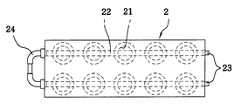 도 2 및 도 4를 참조하면, 상기 여과액 포집 이송블록(2)은 중공사막 모듈(1)에서 여과처리된 여과액을 포집하기 위한 블록으로서, 상기 중공사막 모듈(1)의 상단, 즉 상부 어댑터(12)를 지지함과 아울러 중공사막 모듈에 의해 여 과처리된 여과액이 당해 블록 내부로 유입될 수 있도록 하기 위한 다수개의 접합홀(21)이 등간격으로 형성된다. 또한, 그 내부에는 상기 접합홀(21)과 연통된 여과액 이송라인(22)이 블록의 길이방향을 따라 형성된다. 상기 여과액 이송라인(22)의 단부에는 외부로 노출된 여과액 출구(23)가 구비되어 있다.2 and 4, the filtrate