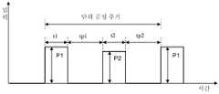 다음에, 초순수(Distilled Water, 이하 'DIW')의 수증기를 반응실로 유입하 여 압력 200mTorr(P2)의 상태에서 1초(t2) 동안 유지되도록 한다. 이어서, TMA의 유입을 중단시키고, 반응실의 미반응한 잔류 기체를 제거하기 위하여 Ar을 14초(tp2) 동안 반응실로 유입한다.Next, water vapor of distilled water (hereinafter referred to as 'DIW') is introduced into the reaction chamber and maintained at a pressure of 200 mTorr (P2 ) for 1 second (t2 ). Then, the inflow of TMA is stopped and Ar is introduced into the reaction chamber for 14 seconds (tp2 ) to remove unreacted residual gas from the reaction chamber.