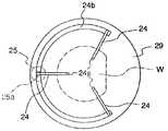 또한, 적재대(20)에는 후술하는 바와 같이, 적재된 웨이퍼(W)를 가열할 때에 적재대(20)의 웨이퍼 적재부로부터 이격된 가열 위치까지 상승시키는 핀 구동 장치(25)에 의해 승강되는 웨이퍼 리프트 수단(24)이 배치되어 있다. 이 웨이퍼 리프트 수단(24)은 도 2a 및 도 2b에 각각 도시한 바와 같이 구성되어 있고, 처리 용기(10)의 하부에 배치된 적재대(20)의 베이스(29)의 하면에 액압 실린더(25: 핀 구 동 장치)가 배치되며, 그 실린더 로드(25a)의 선단부에는 말굽 형상의 지지 부재(24b)가 고착되어 있다. 그리고, 이 지지 부재(24b)에서 반경 방향 안쪽으로 연장된 아암(24)의 소정 부분, 예컨대 세 부분에 위쪽으로 돌출한 그 선단부에 뾰족한 두부(頭部)를 갖는 지지핀(24a)을 세워 설치하고, 지지핀(24a)으로부터 웨이퍼(W)를 3점 지지하여 거의 수평으로 유지한다. 그리고, 가열 램프(19)에 의한 웨이퍼 가열시, 액압 실린더(25)를 작동시켜 웨이퍼(W)를 전술한 가열 위치까지 상승시키도록 되어 있다.In addition, as described later, the mounting table 20 is lifted by a