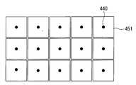 여기서 투명 기둥(451)과 주변의 공기와의 굴절율 차이에 의해 측벽에서 출사되는 빛이 억제된다. 또한 투명 기둥(451)은 상부로 갈수록 단면적이 커지는 구조이므로 발광 다이오드(440)로부터의 빛이 투명 기둥(451)의 측면에 입사하는 입사각이 커져 전반사가 유도된다. 따라서 투명 기둥(451)의 측면을 통해 인접한 다른 투명 기둥(451)에 영향을 주는 빛의 양이 감소되어, 각 발광 다이오드(440) 별로의 휘도 제어가 용이해진다.The light emitted from the sidewall is suppressed by the difference in refractive index between the