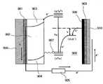 도 9를 참조하면, 태양광이 소자에 입사되면 광감응형 염료(907) 속의 채워진 에너지 궤도에 속하는 전자가 여기되어 전자가 채워지지 않은 빈 궤도로 올라가고, 이 여기 전자는 TiO2 다공질 전극(902)과 도전성 투명전극(901)을 통하여 외부로 이동한다. 한편 광감응 염료(907)에서 전자가 빠져나간 자리는 전해질(906) 속에 있는 이온이 탄소나노튜브(908)와 투명전극(909)으로 구성된 상대전극으로부터 받아온 전자를 전달함으로써 채워진다. 도 9에서 참조번호 900은 상부 투명기판, 903은 TiO2 다공질 전극의 전도대, 904는 TiO2 다공질 전극의 가전도대, 905는 외부의 전기부하, 910은 투명 또는 불투명의 하부기판을 각각 나타낸다.Referring to FIG. 9, when sunlight is incident on the device, electrons belonging to a filled energy orbit in the
