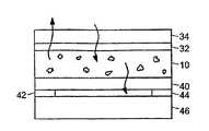본 발명의 또다른 실시양태에 따라, 전달 성분은 전열 프린터 또는 고온 스탬핑기가 그래픽 디스플레이 (예를 들어, 키보드상의 키, 기기 패널 디스플레이 등) 상에 전기발광 복합체를 배치하는데 사용될 수 있도록 구성될 수 있다.  특히, 전달 성분은 도 5에 도시된 바와 같이, 복합체 (10), 투명 전도층 (32), 보호층 (34), 릴리이스층 (36) 및 캐리어층 (38) 뿐만 아니라 복합체 (10)의 반대 면에 접착층 (40)을 포함할 수 있다.  전달 성분을 도 6에 도시된 바와 같이, 그래픽 디스플레이 (46) 상의 하나 이상의 전도체 (42 및 44)에 적용한 후 캐리어층 및 릴리이스층 (36 및 38)을 제거할 수 있다.  이 공정에서, 캐리어층 (36)은 디스플레이 (46)에 전달되는 파손가능한 성분에 구조적 지지체를 제공하는 기능을 할 수 있다.  특정 실시양태에서, 복합체 (10) 중 중합체 물질은 별도의 접착제 (40)가 요구되지  않는 접착성을 포함할 수 있다.  유사하게, 특정 실시양태에서, 전도층 (32)은 별도의 보호 코팅 (34)이 요구되지 않는 충분한 보호 특성을 포함할 수 있다.  또한, 전도층은 어떠한 인광 입자도 전도층과 접촉하지 않도록 보장하기 위해 유전체로 된 코팅을 포함할 수 있다.  특정 실시양태에서 릴리이스층 또는 브레이크 코트층은 전달 후 복합체와 함께 잔류할 수 있고, 그 자체가 최종 소자에서 보호층으로서 기능할 수 있다.  "브레이크 코트"는 또한 "보호 코팅"으로서 작용할 수 있고, 때때로 그렇게 작용한다.According to another embodiment of the present invention, the transfer component can be configured such that an electrothermal printer or hot stamper can be used to place the electroluminescent composite on a graphical display (eg, a key on a keyboard, an instrument panel display, etc.). . In particular, the delivery component is composed of the composite 10, the transparent