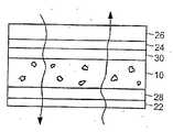 또다른 실시양태에서, 소자는 또한, 도 4에 도시된 바와 같이, 인광 입자가 전도층과 직접 접촉하지 않는 것을 보장하기 위해 전도층 중 어느 하나 또는 둘다와 복합체 사이에 한 층 또는 두 층의 추가 유전층 (28 및 30) (예를 들어, 약 0.02 내지 약 0.5 밀)을 포함할 수 있다.  또한, 보호 필름 (26)은 사람이 임의의 전도체 또는 하부 모선 또는 다른 교류 공급원과 직접 접촉하는 것을 보호하는 기능을 할 수 있고, 또한 소자에 추가의 구조적 보존성을 제공할 수 있다.  또한, 투명한 보호 필름을 사용하여 분진 및 스크래치를 방지하고, 전기발광 소자에 추가 구조적 지지체를 제공할 수 있다.  이러한 필름은 접착성, 표면 에너지 및 수증기 투과율에 대한 조건이 만족되는 한, 폴리에스테르, 폴리올레핀, PVC, PVF, 폴리카르보네이트 등을 포함할 수 있다.In another embodiment, the device also adds one or two layers between the composite and either or both of the conductive layers to ensure that the phosphor particles are not in direct contact with the conductive layer, as shown in FIG. 4.