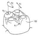 도 1a를 참조하면, 대표적으로 표시한 턱(100)은 16개의 치아(102)를 포함한다. 본 발명은 이들 치아중 적어도 일부의 치아를 초기 치아배열로부터 최종 치아배열까지 이동시키도록 고안되었다. 이들 이빨이 어떻게 이동될 수 있는지에 대한 이해를 돕기 위해, 임의의 중심선(CL)이 하나의 치아(102)를 통해 그려져 있다. 이 중심선(CL)을 기준으로, 치아들은 축(104, 106 및 106; 이중에서 104는 중심선)으로 표시한 수직방향으로 이동될 수 있다. 이 중심선은 각각 화살표 (110 및 113)로 나타낸 바와 같이 축(108;뿌리각도 및 104;토오크)에 대해 회전될 수 있다. 또한, 치아는 화살표(114)로 나타낸 바와 같이 중심선에 대해서 회전될 수 있다. 그러므로, 치아의 모든 가능한 자유-형태의 운동이 실행될 수 있다. 도 1B를 참조하면, 본 발명의 방법과 장치에 의해서 달성된 어떤 치아운동의 크기는 치아(102)상의 어떤 점(P)의 최대 선형이동크기에 의해 규정될 것이다. 각 점(Pi)은 치아가 도 1A에 규정된 어떤 수직 또는 회전방향으로 이동됨에 따라 누적이동이 진행될 것이다. 즉, 그 점이 통상 비선형 경로를 따르는 반면에, 치료 동안에 어떤 2개의 시점에서  결정되면, 치아의 어떤 점 사이의 선형거리가 될 것이다. 그러므로, 제 2임의의 점(P2)이 원호경로를 따라 이동되는 동안에, 최종 이동(d2)으로 되는 임의의 점(P1)이 정의 차례대로 이동이 진행될 수 있다. 본 발명의 많은 실시예는 어떤 특정한 치아에서의 방법에 의해 유도된 점(Pi)의 최대 허용이동에 의해서 규정된다. 그같은 최대 치아이동은 차례대로, 어떤 치료단계에서 그 치아에 대한 최대이동이 진행되는 치아 상의 점(Pi)에 대한 최대 선형이동으로 규정된다.Referring to FIG. 1A, a