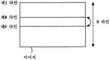 도 2에 도시된 바와 같이, H 라인으로 형성된 이미지가 한 예로 취해진다. 제1 라인과 또 다른 라인 사이의 상관관계에 대해, 도 3의 (A)에서 설명되는 바와 같이, 제 1 라인에 가깝게 위치하는 라인(도 2에 도시된 이미지 중 상단 라인)에 대한 제 1 라인의 상관관계는 크다. 반대로, 제 1 라인에서 멀리 위치하는 라인(도 2에 도시된 이미지 중 하단 라인)에 대한 제 1 라인의 상관관계는 작다. 다른 말로 하면, 도 2에 도시된 이미지는 제 1 라인에 가까운 라인이 더 큰 레벨의 상관관계를 갖고 제 1 라인에서 멀리 있는 라인이 더 작은 레벨의 상관관계를 갖는 상관관계 변경을 갖는다.As shown in FIG. 2, an image formed of H lines is taken as an example. As for the correlation between the first line and another line, as described in FIG. 3A, the first line for the line located close to the first line (the top line in the image shown in FIG. 2). The correlation is large. On the contrary, the correlation of the first line to the line located far from the first line (the bottom line in the image shown in FIG. 2) is small. In other words, the image shown in FIG. 2 has a correlation change where a line close to the first line has a greater level of correlation and a line far from the first line has a smaller level of correlation.