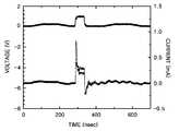 도 10은 도 9의 상전이 메모리 소자를 리셋시키기 위하여 실제로 이용한 전압과 전류펄스의 모양을 보여주는 그래프이다.FIG. 10 is a graph showing shapes of voltage and current pulses actually used to reset the phase change memory device of FIG. 9.
