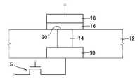 도 2를 참조하면, 종래의 상전이 메모리 소자는 하부 도전막(10)과 상부 도전막(18), 상기 두 도전막(10, 18) 사이에 개재되는 박막 형태의 상전이 물질막(16) 및 상기 하부 도전막(10)과 상전이 물질막(16)을 전기적으로 연결하는 콘택부(14)를 포함한다. 상기 하부 도전막(10) 및 콘택부(14)의 측면은 절연막(12)내에  매립되어 있으며, 상기 콘택부(14)의 접촉면(20)과 상기 상전이 물질막(16)이 전기적으로 연결된다. 또한, 상기 하부 도전막(10)에는 트랜지스터(5)가 전기적으로 연결되어 있으며, 상기 트랜지스터(5)를 통하여 상기 상하부 도전막(10, 18) 및 그 사이에 개재되는 상전이 물질막(16)에 전류가 유입되거나, 상부 도전막(18)을 통하여 유입된 전류가 상전이 물질막(16), 콘택부(14), 하부 도전막(10), 및 트랜지스터(5)를 거쳐 흐를 수 있다.Referring to FIG. 2, a conventional phase change memory device includes a lower