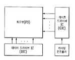 도4a에 도시한 바와 같이, 각 화소(P : 도시하지 않음)로 구성된 화소부와(PS), 상기 화소부(PS)를 구동하기 위한 외부 구동회로가 집적화된 게이트 드라이브 IC(GIC) 및 데이터 드라이브 IC(DIC)와, 데이터 드라이브 IC에 인가되는 데이터신호의 인가시기를 콘트롤하는 타이밍 콘트롤러로 구성된다.As shown in Fig. 4A, a pixel portion PS including each pixel P (not shown), a gate drive IC GIC and data in which an external driving circuit for driving the pixel portion PS is integrated. And a timing controller for controlling the application timing of the data signal applied to the data drive IC.