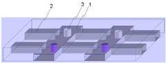 도 3a은 본 발명의 일실시예에 따른 미세유체 칩(차단벽 설치전)의 사시도이다. 기판과 접합한 단일층의 채널 구조체내에 두개의 샘플 채널(1)과 두개의 프로브 채널(2)가 서로 교차하고 있으며, 교차점에 프로브 고정화 영역(3)이 형성되어 있다.3A is a perspective view of a microfluidic chip (before installation of a blocking wall) according to an embodiment of the present invention. Two