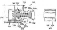 유로(362)를 설명하면, 유로의 내부에는 핀(365)의 몸통부(365b)를 지지하며  다수의 통공(363a)이 형성되는 지지부(363)가 구비되며, 상기 지지부(363) 및 핀(365)의 유동부(365a)의 사이에는 스프링(364)이 구비된다. 그리고, 접속구(480)는 개폐부재(360)의 외측 유로(362b)의 외경보다 큰 내경을 가지는 외측부(482)와, 상기 외측 유로(362b)의 내경보다 작은 외경을 가지는 내측부(484)로 구성된다.Referring to the