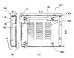레버(150)는 L자 형상을 구성하는 전방판(151a) 및 측판(151b)과, 결합부(152)와, 방열 구멍(153)과, 부착 구멍(154)과, 갈고리부(155)와, 접속 해제부(156)와, 경사변(157)(도9)을 갖는다.  전방판(151a) 및 측판(151b)의 경계에는 방열 구멍(153)이 마련된다.  방열 구멍(153)은 케이스(120)의 방열 구멍(123a)과 연통한다.The