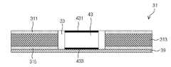 전자부품(43)은 상기 기재(31)와 실질적으로 동일한 두께를 갖는다. 그리고 상면 및 하면에는 제1전극(431) 및 제2전극(433)이 각각 형성되어 있다. 상기 제1전극(431) 및 제2전극(433)은 상기 접합층(37)과 접한다. 전자부품(43)은 트랜지스터(transistor), IC, LSI 등과 같은 능동소자 또는 저항(resistor), 콘덴서(condenser) 또는 인덕터(inductor)와 같은 수동소자일 수 있다.The