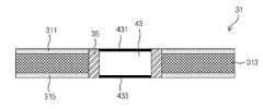 도 11은 상기 기재(31)에 전자부품(43)의 전극(431, 433)과 접하는 상기 접합층(37)을 형성한 상기 S40 단계를 나타낸 단면도이다. 도 11에 도시된 바와 같이 상기 접합층(37)은 구리 도금 등에 의해 상기 기재(31)의 양면에 적층되어 전자부품(43)의 전극(431, 433)과 접합한다. 물론, 도 4 내지 도 5에 도시된 바와 같이 전자부품(43)의 일면에 전극이 형성된 경우에는 상기 접합층(37)을 상기 기재(31)의 일면에만 형성할 수도 있다.11 is a cross-sectional view showing the step S40 in which the