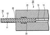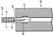 그러므로, 이러한 변형예에서, 페룰(21)에 형성되어 있고 그 내면에 고정용 홈부(23)를 가진 위치선정용 안내구멍(22)의 양끝으로부터 광섬유(10)가 페룰(21)로 삽입될 때, 광섬유(10)의 피복재(12)는 열변형되어, 피복재(12)의 일부가 홈부(23)에 의해 물리게 됨으로써 광섬유(10)를 고정하게 된다. 그 결과, 축방향 힘만 광섬유(10)의 접촉부분, 즉 광학적인 연결부에 가해지고, 방사상 힘은 가해지지 않게 된다.Therefore, in this modified example, when the