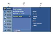 즉, 상기 자동채널 검색조건은 도 2에 도시된 바와 같이, 메뉴상에서 사용자가 채널(401)을 선택하면, 채널에 대한 채널설정 메뉴(402)가 디스플레이되고, 이중 사용자가 선호장르를 선택하면 사용자가 원하는 장르(스포츠, 음악, 드라마 등)를 선택할 수 있는 메뉴(403)가 디스플레이 되며 이중 하나 또는 복수개를 선택할 수 있으며, 원하는 시간대를 선택하게 된다.That is, as shown in FIG. 2, when the user selects the