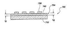 도 7은 본 발명의 선택적인 실시예에 대한 횡단 다이어그램을 나타낸다. 편광자(700)은 투명 기질(710)에 의해 지지되는 복수개의 평행, 연장 전도성 요소(720)들로 구성된다. 절연 재료로 된 하나 이상의 층 혹은 필름(740)이 전도성 요소(720)와 기질(710)에 삽입된다. 층 혹은 필름(740)은 두께 tF, 굴절률 nF를 갖으며, 영역 두께 tR을 갖는 영역(734)을 정의한다. 공명 포인트를 짧은 파장으로 변형시키는 요망 효과를 얻기 위해서, 절연 층(740) 중 적어도 하나는 기질(710)의 굴절률 nS보다 작은 굴절률 nF를 가져야 한다. 즉, 조건 nF<nS를 만족시켜야 한다.7 shows a cross-sectional diagram for an alternative embodiment of the present invention.