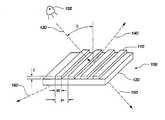 도 1은 종래 기술의 기본적인 와이어 그리드 편광자를 도시하고, 종래 기술 및 본 발명에 관한 일련의 사례들에 사용될 용어들을 정의한다. 와이어 그리드 편광자(100)는 절연 기질(120)에 의해 지지되는 여러개의 평행한 전도성 전극(110)으로 구성된다. 이 장치는 전도체의 주기 혹은 피치(pitch), p로 표시; 개별 전도체의 폭, w로 표시;  전도체의 주께, t로 표시된다. 광원(132)에 의해 생성된 빛의 광선(130)은 법선으로부터 각 Θ로 편광자에 입사된다. 이때, 입사 평면은 전도성 요소에 수직이다. 와이어 그리드 편광자(100)는 이러한 광선을 반사 성분(140)과, 비-회절형 투과 성분(150)으로 분할한다.  방정식(2)에 의해 주어진 가장 긴 공명 파장보다 짧은 파장에 대해서, 적어도 하나의 고차 회절 성분(160)이 있을 것이다. S, P 편광에 대한 일반적인 정의를 사용할 때, S 편광을 갖는 빛은 입사평면에 대해 직교인 편광 벡터를 가지므로, 전도성 요소에 평행하다. 반대로, P 편광을 갖는 빛은 입사 평면에 평행인 편광 벡터를 가지므로 전도성 요소에 직교한다.1 shows a basic wire grid polarizer of the prior art and defines terms to be used in the prior art and a series of examples relating to the invention. The