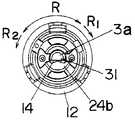 한편, 화살표 R로 표시하는 바와 같이, 샤프트(3)를 그 축주위로 왕복 회전구동시키는 경우, 제2 가동자(6)와 용수철부재(13a, 13b 및 13c)로, 제2 가동자(6)의 롤링 구동의 진동계를 구성한다.  즉, 제2 가동자(6)의 롤링 구동에 따라 세 개의 용수철부재(13a, 13b 및 13c)는 샤프트(3)의 축주위에서의 제2 가동자(6)의 롤링 구동에 따라, 감김 조임 방향 및 느슨한 방향으로 비틀어진다.  그 결과, 제2 가동자(6)의 샤프트(3)의 축주위에 회전을 방해하는 방향으로 밀어붙이는 힘을 부여한다.  이 용수철부재(13a, 13b 및 13c)의 용수철 정수와 제1 가동자(36)와 제2 가동자(6)의 총 질량으로 결정되는 공진주파수 부근의 전류를 제2 코일(7)에 공급함으로써, 제2 가동자(6)의 진동량(진폭량)을 크게 할 수 있다.On the other hand, as indicated by the arrow R, when the