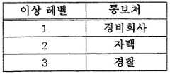 이러한 테이블의 일례를 도 10에 도시한다.  이상 레벨 1의 경우는 상기한 바와 같이, 차량에 직접 인적 작용이 가해졌다고는 할 수 없고, 도난 예비 행위가  행하여지지 않았을 가능성도 있다.  그래서, 차량 주변의 순찰을 의뢰하기 위해서 예를 들면 계약한 경비 회사를 통보처로서 결정한다.An example of such a table is shown in Fig. In the case of the