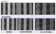 노광 테스트 결과를 수, 우, 미, 양, 가로 나타내었다. 노광 패턴을 PAD : DAS : 감광성PVA 조성비로 대비하여 도3의 사진으로 나타내었다. 실시예 2,5,6,7번이 현재 29인치 브라운관 양산상태와 동등수준을 나타냄을 알 수 있다. 실시예 2,5,6,7번으로 재 노광 테스트 결과 실시예 7이 최적의 조성으로 선정되었으며, 실시예7과 29인치 브라운관 양산상태의 상세한 노광패턴을 비교한 사진은 도4와 같다.The exposure test results are shown as numbers, right, beauty, quantity, and width. The exposure pattern is shown in the photograph of FIG. 3 in contrast with PAD: DAS: photosensitive PVA composition ratio. It can be seen that Examples 2, 5, 6, and 7 exhibit the same level as the mass production state of the 29-inch CRT. As a result of the re-exposure test with Examples 2, 5, 6, and 7, Example 7 was selected as the optimal composition, and the photograph comparing the detailed exposure pattern of Example 7 and the mass production of 29-inch CRT tube is shown in FIG.