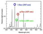그러나 상기와 같은 종래의 감광액 조성물은 광경화 속도가 늦고 도1에서 보이는 바와 같이 수은램프의 일부 파장 만을 사용하여 많은 광량과 더 센 광원, 긴 프로세싱(노광) 시간이 필요할 뿐만 아니라 매우 비효율적이었다. 이러한 결점은 칼라브라운관 생산에 있어서 경제적, 생산 효율적으로 매우 불리하다. 도1에서 보는 바와 같이 광원인 수은램프에서 발생되는 파장은 i-라인 (365nm), h-라인 (405nm), g-라인 (435nm) 등이 있는데 실제 감광제인 DAS는 이중 i-라인만을 흡수한다.However, the conventional photoresist composition as described above has a slow photocuring rate and requires only a few wavelengths of the mercury lamp as shown in FIG. 1, requiring a large amount of light, a stronger light source, and a longer processing (exposure) time as well as being very inefficient. This drawback is very economically and productively disadvantageous in the production of color CRTs. As shown in FIG. 1, the wavelengths of the mercury lamp, which is a light source, include i-line (365 nm), h-line (405 nm), and g-line (435 nm). DAS, which is actually a photoresist, absorbs only dual i-lines. .