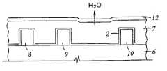 전형적인 라이너층, 예컨대 질화규소(SiN)는 산화 규소보다 더 높은 유전 상수를 가지며, 고 k 유전 라이너층과 저 k 유전층의 조합물은 전체 다수 유전 상수 및 용량 커플링을 거의 향상시키지 못하거나 전혀 향상시키지 못한다.  도 1d를 참고하면, 층(7)의 증착후에, 임의적 캡핑층(12)이 유기실란 또는 유기실록산 화합물과 N2O와 같은 산화 가스의 플라즈마 강화 반응으로 저 k 유전층(7) 위에 증착될 수 있다.  도 1e를 참조하면, 캡핑층이 존재하는 경우 캡핑층의 증착후에, 증착된 층을 로(furnace) 또는 다른 챔버에서 경화하여 존재하는 용매 또는 물을 제거한다.  또한, 캡핑층(12)은 양호한 배리어 특성과 약 3.0의 유전 특성을 갖는 산화된 유기실란 또는 유기실록산막이다.  라이너층(2)와 캡핑층(12) 모두는 3.0 보다 큰 유전 상수를 가지며 높은 유전 상수층은 실질적으로 저 k 유전층(7)의 이점을 감소시킨다.Typical liner layers, such as silicon nitride (SiN), have higher dielectric constants than silicon oxide, and the combination of high k dielectric liner layers and low k dielectric layers provides little or no improvement in overall multiple dielectric constant and capacitive coupling. can not do it. Referring to FIG. 1D, after deposition of