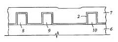 도 1a 내지 1e는 국제 공개번호 WO 99/41423호에서 개시된 바와 같이 산화된 유기실란 또는 유기실록산 폴리머의 PECVD 라이닝층(2)을 증착시켜 3층 증착 PECVD 공정을 도시한다.  라이닝층(2)은 기판 표면에 형성된 생성된 층(7), 기부 기판 표면(6), 및 금속 라인들(8,9,10) 사이에서 분리층으로 작용한다.  층(7)은 산화된 유기실란 또는 유기실록산 폴리머의 PECVD 캡핑층(12)에 의해 캡핑된다.  PECVD 공정은 다중 성분 유전층을 증착시키며, 탄소 함유 이산화 규소(SiO2)가 기판(6) 위에 형성된 금속 라인(8,9,10)을 갖는 패턴화된 금속층 위에 첫번째로 증착된다.1A-1E illustrate a three layer deposition PECVD process by depositing a