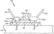 적외선 가열기들(130)은, 각각 본딩 패드들(BP)을 포함하는 다이(150)의 상부 표면(150a) 및 다이(160)의 상부 표면(160a)과, 그리고 기판(140)의 "본딩 영역", 즉 본딩 패드(BP)들을 갖는 기판(140)의 일부 상부 표면(140a)을 가열하기 위하여, 와이어 본딩될 패키지 구조의 위쪽에 위치된다. 적외선 가열기들(130)은 통상의 적외선 램프들 또는 건들이거나, 와이어 본더(100)에 이용할 수 있는 한정 공 간에서의 동작을 위해 최적으로 특별 설계된 적외선 가열기일 수 있다. 예를 들어, 유연한 광섬유 튜브가 기판(140) 및 다이들(150, 160)을 향해 적외선을 방사하는 데에 이용될 수 있다.