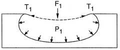 도 17b는 공기 주머니(16)에 인가되는 소량의 힘을 모시적으로 예시한다.  예컨대, 사람이 정지하여 서있고, 외력으로 표현된 외력 F1이 뒷꿈치의 종골에 의해 공기 주머니(14)에 인가된다.  도 17b에 도시된 바와 같이, 외력 F1은 제1 주표면(18)을 어느 정도 하향 만곡되게 하고, 공기 주머니(14) 내의 체적이 감소되며, 이로 인해 압력이 압력 P1으로 증대된다.  또한, 제1 주표면(18)이 활 모양으로 휘어지는 것에 의해, 제1 주표면(18)에서의 인장이 T1으로 증대된다.  이 도면에 예시되어 있지는 않지만, 외력 F1 - F3이 인가될 때 엘라스토머 재료(13)도 압축된다.  하향 외력에 의한 발포 재료(13)의 압축과 공기 주머니(16) 내의 압력 증대가 협력하여, 발포 재료의 벽을 안정화시키는데 기여한다.17B exemplarily illustrates a small amount of force applied to the
