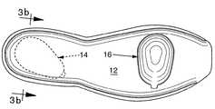 공기 주머니(16)는 탄성 발포 재료 내에 탑-로드 형태로 배치된 것으로 도시되어 있지만, 공기 주머니(14)의 경우와 마찬가지로 하중에 대하여 다양한 반응을 제공하도록 뒤집어질 수 있다.  도 2a에 도시된 바와 같이, 공기 주머니(16)의 종방향 축선이 착용자의 중족골 골두의 방향과 정렬되는 공기 주머니(16)의 방위는, 광범위한 착용자에 대해서 바람직한 충격 흡수 반응을 제공할 것이다.  그러나, 이러한 방위는 전술한 바와 같이 주문에 맞춰진 반응을 획득하도록 회전될 수 있다.The