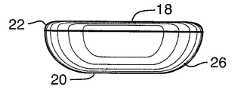 이와 유사하게, 중창의 중족골 골두 영역에 있는 것으로 예시된 공기 주머니(16)도 그 방위에 따라 다양한 충격 흡수 특성을 제공할 수 있다.  또한, 공기 주머니(16)는 거의 평탄한 제1 주표면(28)과, 역시 거의 평탄하고 그 면적이 제1 주표면(28)보다 작은 제2 주표면(30)을 구비한다.  상기 제2 주표면의 표면적은 대략 제1 주표면의 표면적의 25 내지 40% 정도이다.  이들 주표면은 서로에 대해 거의 평행하고, 제1 경계부(32) 및 제2 경계부(34)에 의해 그 범위가 한정되며, 이들 경 계부는 공기 주머니(14)의 측벽(26)과 유사한 측벽(36)에 의해 연결된다.  제2 주표면(30)의 크기가 비교적 작기 때문에, 측벽은 비교적 평평한 경사를 갖고, 다시 말해서 공기 주머니가 탄성 발포 재료 내에 배치될 때, 공기 주머니로부터 발포 재료로의 반응 전환이 공기 주머니(16)의 경우에 매우 서서히 일어난다.Similarly, the