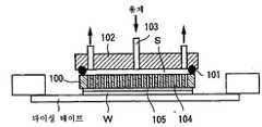 이 방법은, 먼저, 서포트 플레이트(100)의 윗면에 O링(101)을 매개로 하여 용제 공급 플레이트(102)를 쌓아 올린다. 이어서, 서포트 플레이트(100), O링(101) 및 용제 공급 플레이트(102)로 둘러싸인 공간(S)에 용제 공급관(103)으로부터 용제를 공급한다. 이에 따라, 서포트 플레이트(100)에 형성된 관통구멍(104)를 매개로 하여 접착제층(105)를 용해하도록 한 것이다.In this method, first, the