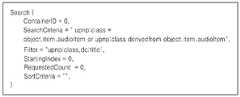 도 2는 제어 포인트(101)이 미디어 서버(102)에 전송하는 Search()를 도시한다.  Searchcriteria = ""에 포함된 조건에 의해 검색을 하되 Filter = "" 에 포함된 클래스만을 리턴(return)하도록 콘텐츠 검색을 요청한다.2 shows Search () that