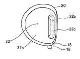 또한, 솔부(22)는 티탄 합금, 마그네슘 합금, 스테인레스 합금 및 알루미늄 합금 등으로부터 선택된 합금으로 구성된 솔 본체부재(22a)와 당해 솔 본체부재(22a)에 설치된 슬릿상 절결부(22b)에 계합하여, 절결부(22b) 주위의 솔 본체부재(22a)와 접착되어 절결부(22b)를 폐색하는 폐색부재(22c)로 구성된다.In addition, the