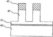 도 2a, 2b에 에칭처리 도중의 피처리재(4)의 종단면형상 및 간섭광의 파장 실제패턴의 예를 나타낸다.  도 2a에 있어서 피처리재(웨이퍼)(4)는 기판(40) 위에 베이스재(41), 그 위에 피에칭재(42), 마스크재(43)가 적층되어 있다.  예를 들어 게이트막의 에칭을 행하는 경우, 피처리재(4)의 기판은 SiO2의 절연막이며, 소스, 드레인 사이에 대응하여 다결정의 베이스재 위에 폴리실리콘의 게이트층이 형성된다.2A and 2B show examples of longitudinal cross-sectional shapes of the