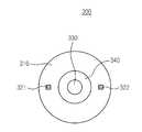 상기 도파로(310)는 그 중심부에 상기 광검출기(330) 및 상기 광검출기(330)를 둘러싸는 차단층(340)이 삽입되며, 상기 제2 면(310b) 상에는 상기 각 광원(321,322)에서 생성된 광을 균일한 세기로 대상 신체 부위로 조사하기 위한 확산 패턴들(311,312)이 형성된다. 상기 확산 패턴(311,312)은 상기 도파로(310)의 길이와 입사되는 광의 각도 등의 조건에 따라서 반사되는 광의 각도 등에 따라서 그 형태 및 크기를 결정할 수 있다.The