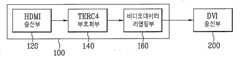 HDMI 형식의 데이터를 송신하는 장치는 TERC4 부호를 사용하여 데이터를 전송한다. 그러나,DVI 형식의 데이터를 전송하는 장치에서는 TERC4 부호화를 지원하지 않기 때문에 DVI 전송장치가 지원하는 비디오 부호화(video encoding) 규격으로 TERC4 부호값을 변환하는 디지털(digital) 형식의 변환부가 별도로 마련되어야 한다.An apparatus for transmitting data in HDMI format transmits data using a TERC4 code. However, since a device that transmits data in theD VI format does not support TERC4 encoding, a digital conversion unit for converting the TERC4 code value to a video encoding standard supported by the DVI transmission apparatus must be separately provided. do.