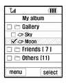 외장 메모리(130)의 접속을 확인하면, 제어부(107)는 사용자에 의해 제1 단말(100a)의 메모리부(109)에 저장된 특정 파일이 선택되어  외장 메모리(130)로 복 사되는지 확인한다(S305). 외장 메모리(130)로 복사하고자 하는 파일을 선택한 화면이 도 4a에 도시된다. 도 4a에 도시된 바와 같이, 사용자가 제1 단말(100a)의 내 앨범(my album) 메뉴의 갤러리(gallery) 폴더에서 달(moon) 사진을 외장 메모리(130)로 복사하기 위해, 그 파일을 선택한다. 제어부(107)는 키입력부(103)를 통한 파일의 선택을 인지하고, 리스트 상태에서 선택된 모습을 표시부(105)에 표시하거나, 선택된 파일의 내용을 표시부(105)에 표시할 수 있다.Upon checking the connection of the