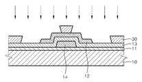 그 후, 도 2f에 도시된 것과 같이 패터닝된 포토리지스트층(30)을 마스크로 이용하여  활성층(12)의 채널 영역(12a)을 가린 상태에서, 노출된 소스 영역(12b)과 드레인 영역(12c)에 대해 수소 이온 임플란트를 행한다. 이 때, 포토리지스트층(30)의 형성 전에 층간 절연막(미도시)을 더 형성한 후, 포토리지스트층(30)을 전술한 바와 같이 형성, 패터닝하여도 무방하다. 수소 이온의 임플란트에 대해서는 전술한 바와 동일하므로 상세한 설명은 생략한다.Thereafter, as shown in FIG. 2F, using the patterned