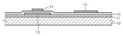 다음, 게이트 절연막(13) 위에 게이트 전극(14)과 캐패시터의 하부 전극(15)을 형성한다. 게이트 전극(14)과 캐패시터 하부 전극(15)은 Al, Mo, W, Cr, Ni 또는 이들의 화합물과 같은 다양한 도전성 재료로 형성될 수 있다. 물론  박막 트랜 지스터의  활성층 외에 다른 구성요소까지도 광이 통과할 필요성이 있을 경우에는, 게이트 전극(14) 및 캐패시터 하부 전극(15)이 ITO 또는 IZO 등과 같은 다양한  도전성 재료로 형성될 수 있다. 이러한 게이트 전극(15) 및 캐패시터 하부 전극(15)은 단일층 또는 다층으로 구비될 수 있다.Next, the