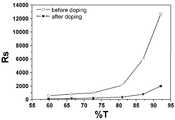 도 5는 본 발명의 일 구현예에 따른 CNT 투명전극의 투과도에 따른 도핑 효과를 도시한 그래프이다.5 is a graph showing the doping effect according to the transmittance of the CNT transparent electrode according to an embodiment of the present invention.