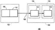 도 1은 VRML 기반의 클라이언트-서버 시스템(100)을 도시한 도면이다.  시스템(100)은 통신 채널(106), 여기서는 인터넷을 통해 클라이언트(104)에 접속된 서버(102)를 포함한다.  도면을 간단히 표시하기 위해서 도시되지 않았으나 시스템(100)은 더욱 많은 클라이언트들을 포함할 수 있다.  서버(102)는 소스 인코더(108) 및 채널 인코더(110)를 포함한다.  클라이언트(104)는 채널 디코더(112) 및 소스 디코더(114)를 포함한다.  소스 인코더(108)는 컨텐트 생성 툴로 여겨진다.  예를 들어, 이것은 비디오 상에서 동작하는 모션 캡쳐 장치들(도시되지 않음)로부터 VRML 애니메이션 데이터를 생성하는 툴일 수 있다. 채널 인코더(110)는 소스 인코더(108)에서 생성된 VRML 애니메이션을 입력으로 취하는 서브-시스템이며 상기 애니메이션을 인터넷을 통해 전송될 수 있는 형태로 변형한다.  VRML 애니메이션 데이터는 파일에 저장된다.  이런 파일의 전송은 표준 파일 전송 프로토콜을 사용한다.  클라이언트(104)에서, 채널 디코더는 외부 프로그램(116)에 포함된다.  이것은 다운로드 파일로부터 애니메이션 데이터를 획득하고, 이것을 소스 디코더 기능을 실행하는 VRML 재생기(118)에 전송한다.  소스 디코더 기능은 본질적으로 장면 그래프의 관리이다. 이런 서버-클라이언트 통신 과정은 스트리밍의 솔루션이 아니다.  VRML의 사양은 요구를 스트리밍하는 것을 고려하지 않는다.  스트리밍에 필수적인 스트림들 간의 동기화 및 시간 스탬핑(time stamping)과 같은 기능들은 VRML에 존재하지 않는다.Throughout the drawings, the same reference numerals indicate similar or corresponding characteristics.