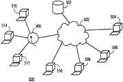 도 5는 본 발명의 시스템(500)의 블록도이다.  시스템(500)은 시스템들(300,400)의 구성들을 결합하였다.  시스템(500)은 서버(302), 네트워크(502), 네트워크(502)를 통해 서버(302)에 접속된 클라이언트들(504,506,508,510)을 포함한다.  시스템(500)은 변환국(406) 및 클라이언트들(512,514,516)를 부가로 포함한다.  클라이언트들(512 내지 516)은 네트워크(502)를 통해 서버(302)와 변환국(406)에 접속된다.  클라이언트들(512 내지 516)은 BIFS 비트 스트림들을 가진 변환국(406)에 의해 동작되고, 클라이언트들(504 내지 510)은 공유 객체들을 지원하는 프로토콜 내의 상태 정보를 수신하고 스스로 애니메이션들을 생성한다.5 is a block diagram of a