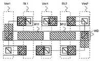 N 채널형 MOS 트랜지스터(TN1)의 소스전극은, 제 3층의 금속배선층에서 형성된 접지전위선(Vss1)에 접속되며, N 채널형 MOS 트랜지스터(TN2)의 소스전극은, 제 3층의 금속배선층에서 형성된 접지전위선(Vss2)에 접속된다. 또한, P채널형 MOS 트랜지스터(TP1, TP2)의 소스전극은, 제 3층의 금속배선층에서 형성된 전원전위선(Vcc1)에 접속되어 있다.The source electrode of the N-channel MOS transistor TN1 is connected to the ground potential line Vss1 formed in the metal wiring layer of the third layer, and the source electrode of the N-channel MOS transistor TN2 is the metal wiring layer of the third layer. It is connected to the ground potential line (Vss2) formed at. The source electrodes of the P-channel MOS transistors TP1 and TP2 are connected to the power source potential line Vcc1 formed in the metal wiring layer of the third layer.