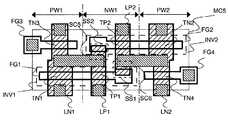 N 채널형 MOS 트랜지스터(TN1) 및 N 채널형 MOS 트랜지스터(TN3)는 확산층(LN1) 상에 형성되고, N 채널형 MOS 트랜지스터(TN2) 및 N 채널형 MOS 트랜지스터(TN4)는 확산층(LN2)상에 형성된다. P 채널형 MOS 트랜지스터(TP1)는 확산층(LP1) 상에 형성되고, P 채널형 MOS 트랜지스터(TP2)는 확산층 (LP2) 상에 형성된다.N-channel MOS transistor TN1 and N-channel MOS transistor TN3 are formed on diffusion layer LN1, and N-channel MOS transistor TN2 and N-channel MOS transistor TN4 are formed on diffusion layer LN2. Is formed. P-channel MOS transistor TP1 is formed on diffusion layer LP1, and P-channel MOS transistor TP2 is formed on diffusion layer LP2.